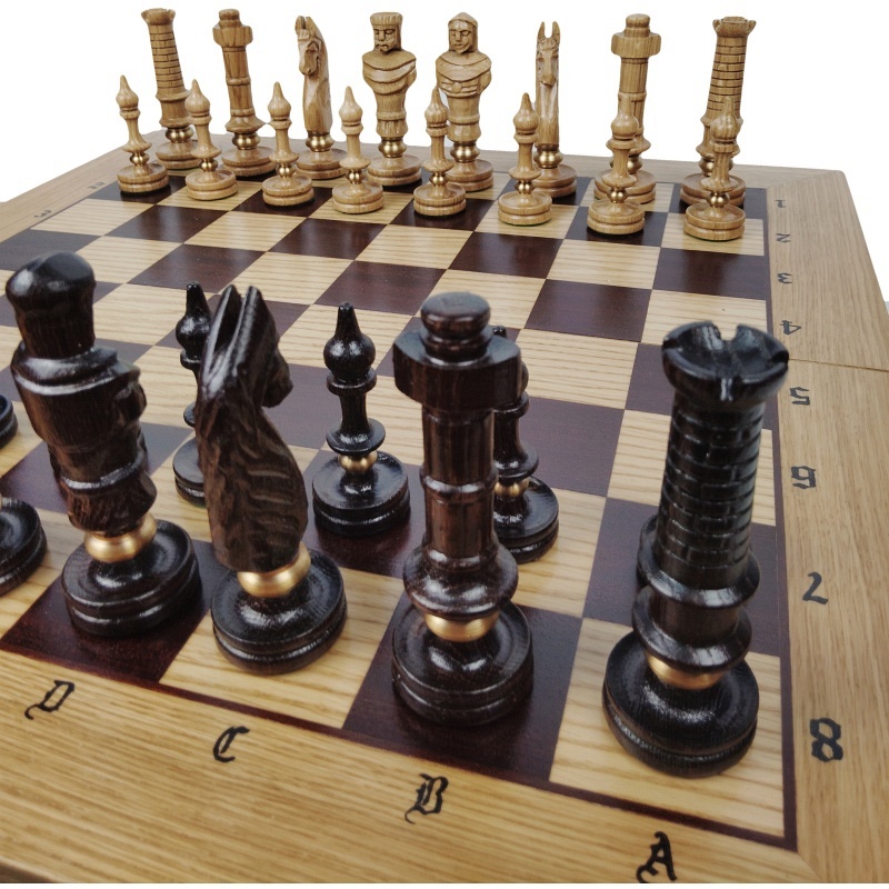 Ces généreux jeux d'échecs en bois de 62 x 62 cm allient à la perfection élégance classique, savoir-faire artisanal et design fonctionnel. Le plateau de jeu est en chêne massif de haute qualité, où le contraste des zones claires et sombres ressort magnifiquement. Les pièces sont sculptées à la main avec un souci du détail et présentent un aspect historique qui les fait ressembler à de véritables miniatures artistiques. Ce jeu est non seulement un outil de jeu, mais aussi un précieux élément décoratif.