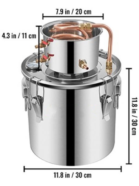 Capacité - Ce distillateur offre une capacité de fermentation de 30 L. Toutes les pièces sont fabriquées à partir de matériaux de qualité alimentaire, notamment du silicone, de l'acier inoxydable et du cuivre.