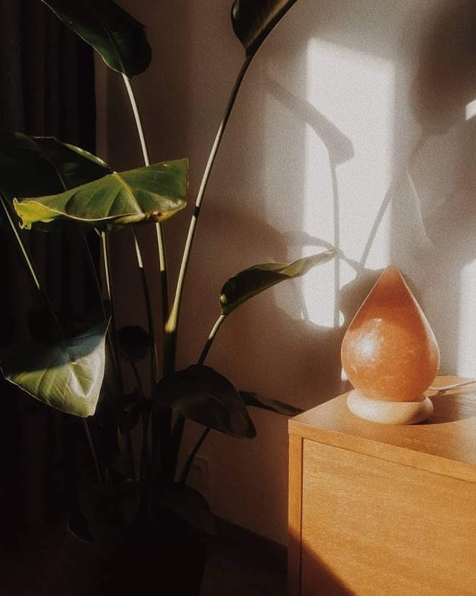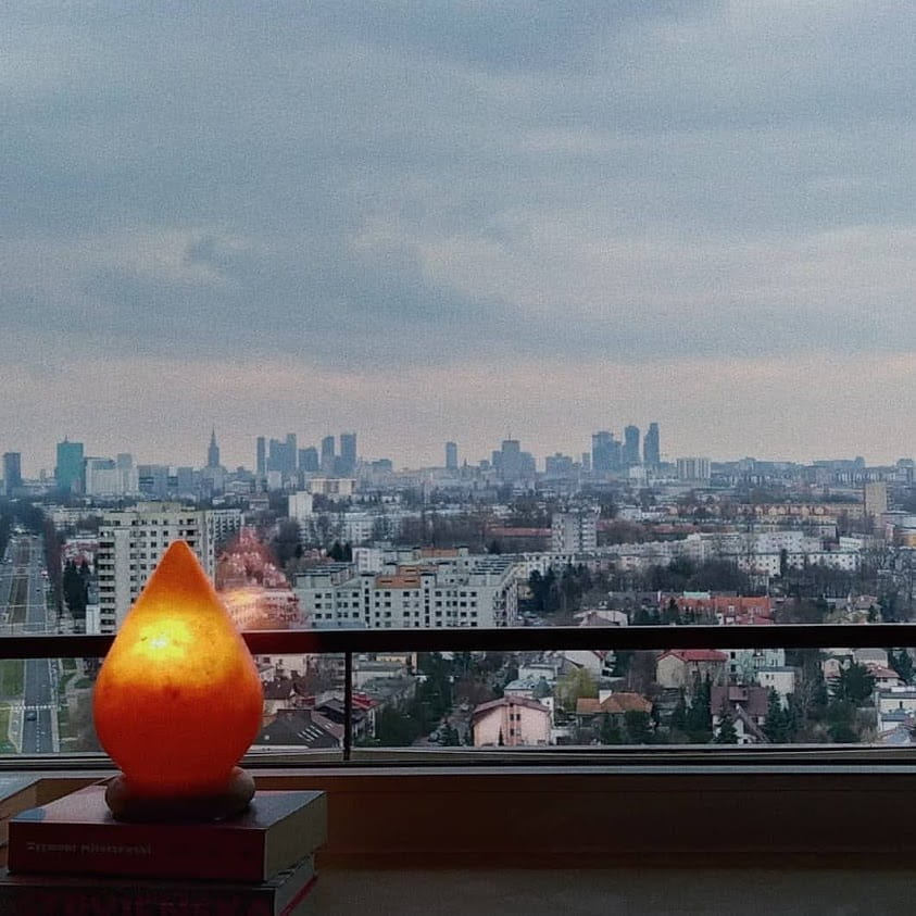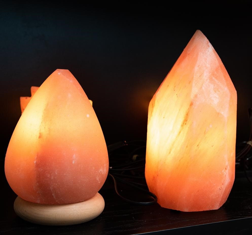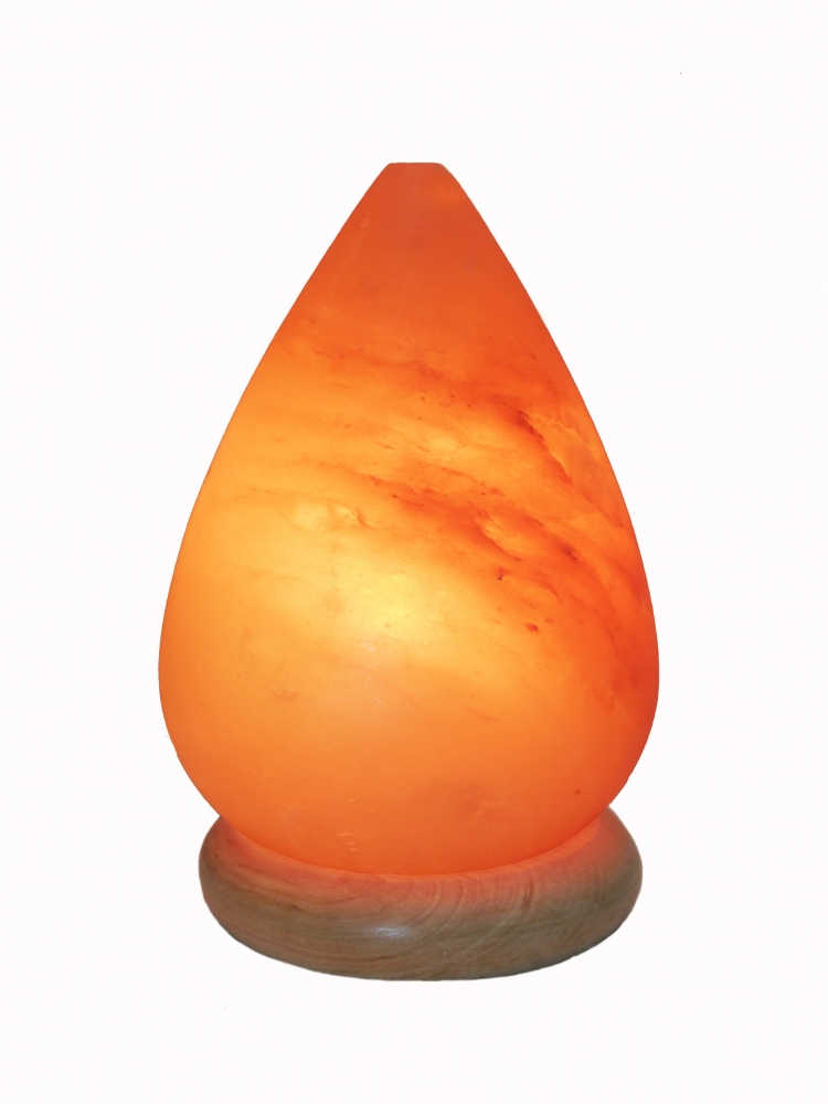 Une lampe de sel est un abat-jour en cristal de sel, d'une teinte orange naturelle et unique, taillé en forme de goutte de pluie et monté sur un socle rond en bois.