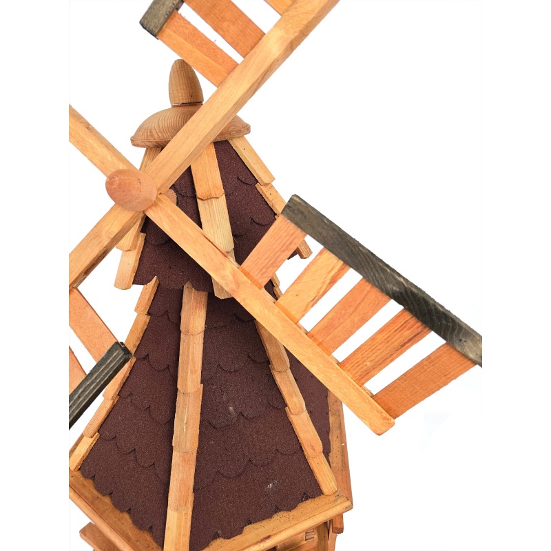 • Fabrication artisanale et traitement de haute qualité du bois naturel - Le moulin est fabriqué en bois massif, ce qui garantit sa stabilité et sa longue durée de vie. Chaque pièce est assemblée à la main avec une attention particulière portée à la précision des assemblages, à la symétrie des hélices et aux détails décoratifs tels que les fenêtres, le toit ou les balustrades. Grâce à ce soin, le résultat est une pièce artisanale unique.