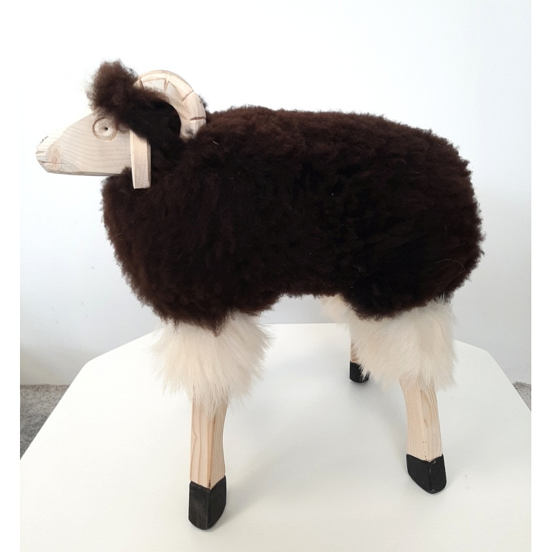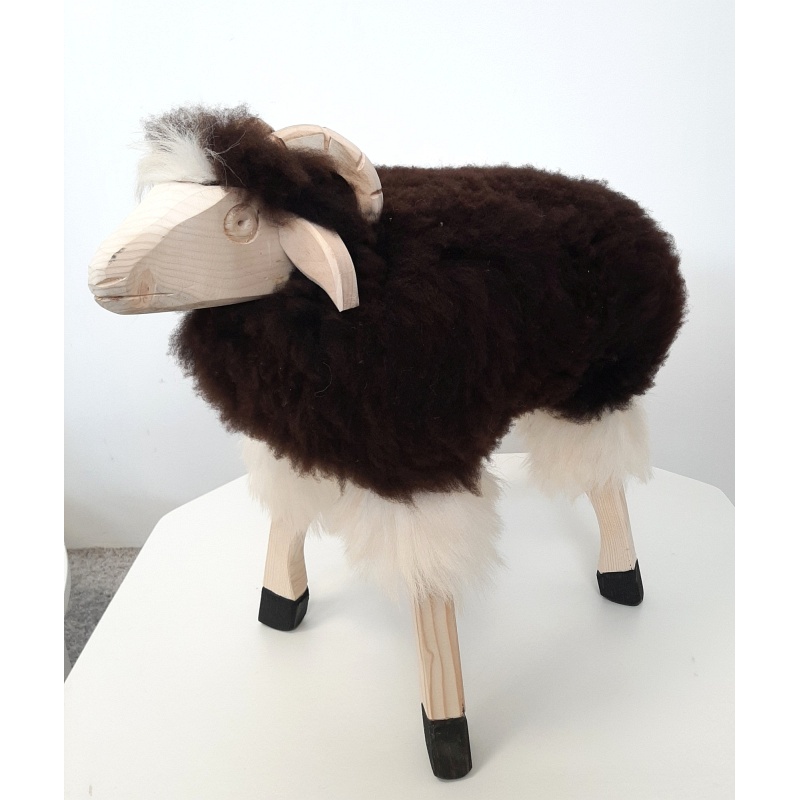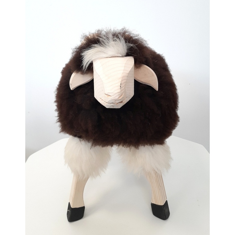 • Peau de mouton authentique – Le corps est en véritable peau de mouton d'une riche couleur brun chocolat avec des bordures blanches, ce qui confère à la figurine un aspect réaliste et chaleureux.