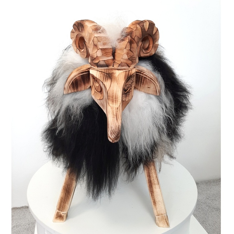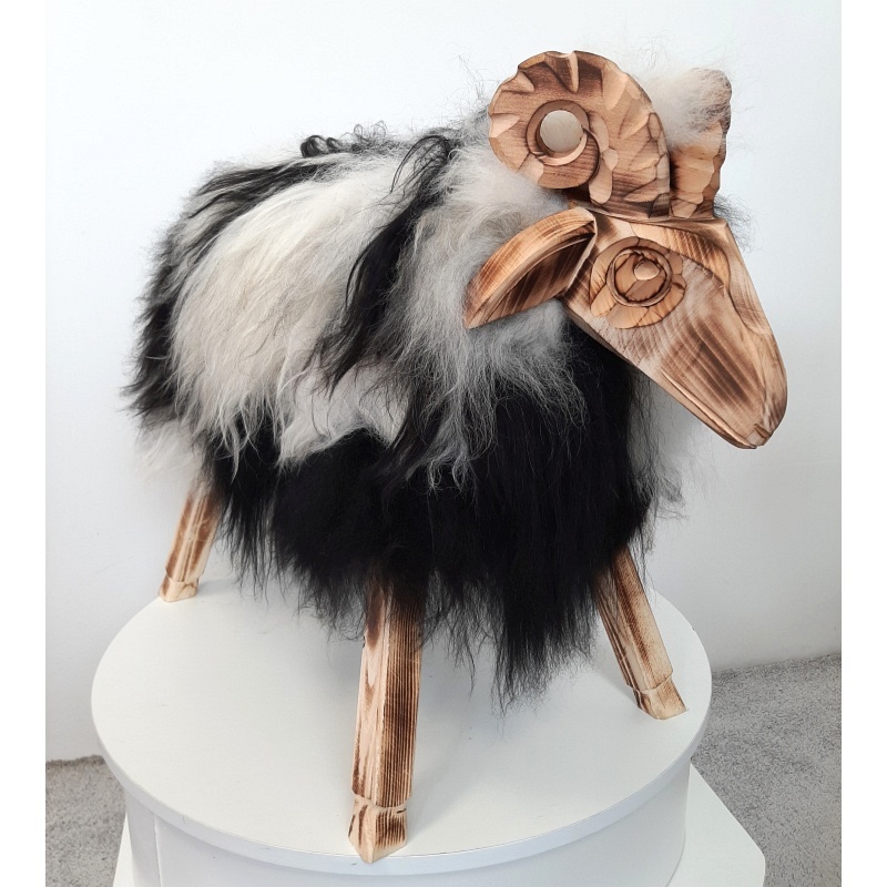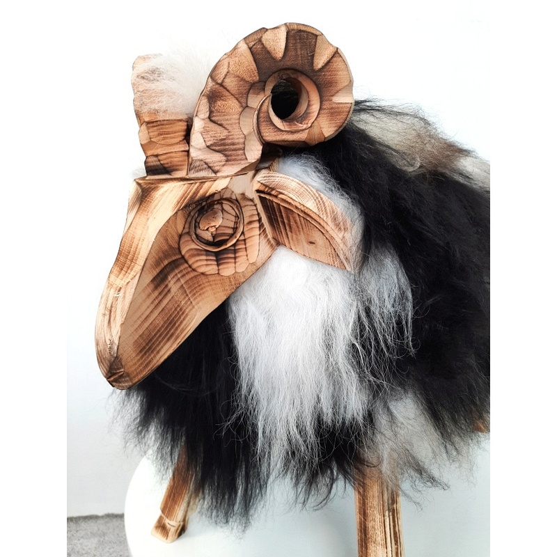 Ce mouton en peau de mouton de 80 × 40 × 60 cm allie à merveille l'artisanat traditionnel slovaque, une esthétique naturelle et une finition exceptionnelle. Son corps est recouvert d'une peau de mouton véritable à la riche structure, aux couleurs naturellement marbrées de noir, blanc, gris et brun, lui conférant un aspect sauvage, authentique et unique. Les éléments en bois massif – tête, pattes et cornes sculptées – sont traités par tannage, ce qui souligne le veinage naturel du bois et son aspect rustique. Chaque pièce est une pièce originale qui apportera chaleur, caractère et âme à votre intérieur.