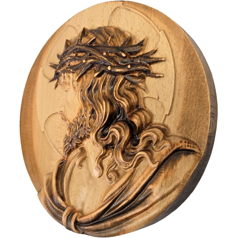 Ce relief en bois de Jésus-Christ couronné d'épines, d'un diamètre de 30 cm, est une puissante expression spirituelle et artistique du sacrifice, de l'humilité et de la rédemption. Il représente Jésus profondément concentré et souffrant, chaque détail de son visage, de ses cheveux, de sa barbe et de sa couronne d'épines étant sculpté avec précision dans du bois massif de haute qualité. La tonicité et la structure du matériau renforcent la force d'expression et laissent une forte impression sur l'observateur. La forme ronde symbolise l'éternité et l'unité, renforçant ainsi la signification spirituelle du motif. Le relief est d'une plasticité particulière : il se détache du fond, crée un jeu d'ombres et de lumières et apparaît presque tridimensionnel. Ce tableau peut approfondir l'atmosphère de prière, de contemplation ou de silence dans tout espace où il est placé.