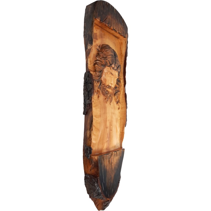 Ce haut relief en bois sculpté à la main représentant Jésus-Christ couronné d'épines allie à la perfection matériaux naturels, art de la sculpture traditionnelle et profonde expression spirituelle. Le visage du Christ, au regard perçant, la tête penchée et une expression de compassion et de douleur, est représenté dans la partie supérieure de l'image, tandis que le reste de la surface est travaillé avec précision, créant un contraste entre détails et humilité.L'image est entièrement réalisée dans une seule pièce de bois massif, dont l'écorce d'origine a été conservée sur les côtés, ce qui souligne le caractère naturel de l'œuvre et lui confère un aspect rustique. Le relief est délicatement teinté et tanné, ce qui met en valeur le veinage du bois et la profondeur de l'expression du visage du Christ. C'est une œuvre qui séduit par son silence, sa force et son authenticité.