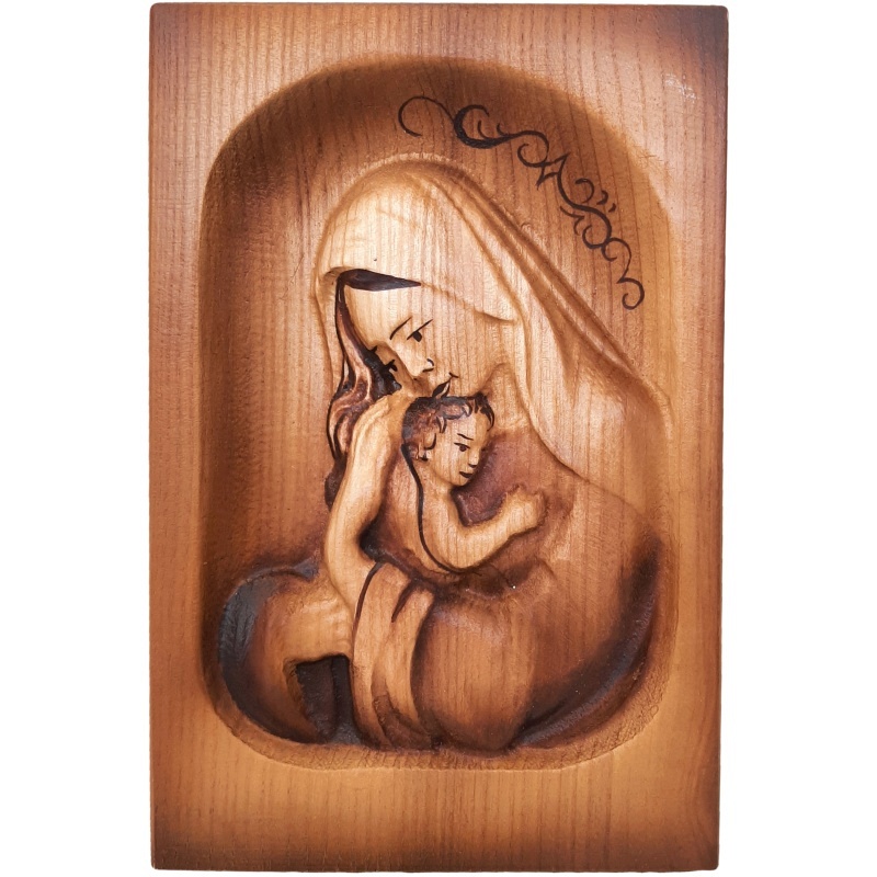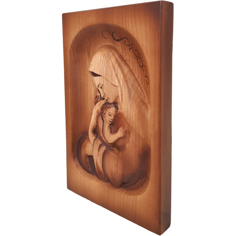 Ce magnifique tableau en bois représente un moment paisible et touchant entre Marie et l'Enfant Jésus : leur étreinte amoureuse est apaisante, protectrice et intemporelle. Le relief sculpté à la main, aux bords délicatement arrondis, ainsi que les détails des visages, des cheveux et des vêtements sculptés, suscitent une forte émotion d'humilité et de confiance. Les éléments décoratifs au-dessus de la tête de Marie confèrent subtilement au tableau une dimension unique et approfondissent sa dimension esthétique et spirituelle.
