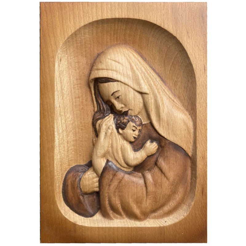 Cette image en bois sculptée à la main de la Vierge Marie avec l'Enfant Jésus, mesurant 18 x 25 cm, est une œuvre spirituelle puissante qui incarne l'amour maternel, la tendresse et l'humilité. La composition expressive capture un moment d'étreinte intime entre Marie et l'Enfant Jésus ; leurs visages sont empreints de paix, de proximité et de profondeur. La mère incline la tête vers l'Enfant et l'embrasse avec un amour infini, créant une scène non seulement esthétique, mais aussi profondément spirituellement impressionnante.