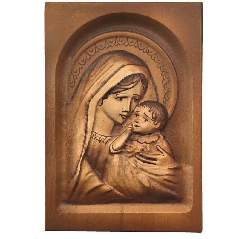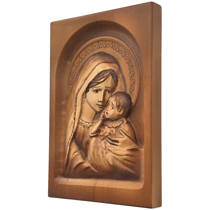 Cette image en bois de la Vierge Marie avec l'Enfant Jésus, mesurant 19 x 13 cm, est une œuvre d'art exceptionnelle, porteuse d'un profond symbolisme spirituel et d'une grande beauté. Le relief sculpté à la main capture un moment d'intimité entre la Mère de Dieu et l'Enfant Jésus : leurs visages sont tendrement rapprochés, leurs regards emplis d'amour et de paix. Le dialogue silencieux des regards, la douceur du toucher et le naturel de l'expression font de ce tableau une scène puissante qui séduira non seulement les croyants, mais aussi tous ceux qui perçoivent la profondeur des relations interpersonnelles.