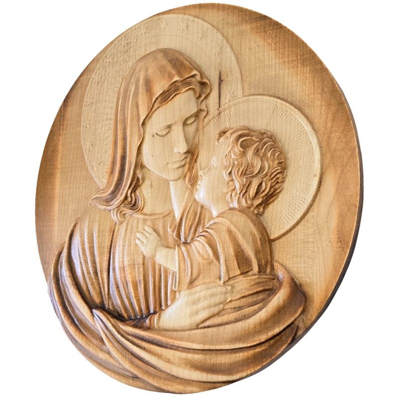 • Excellente qualité d'exécution et finition soignée –Les expressions faciales de la Vierge Marie et de l'Enfant Jésus sont traitées avec délicatesse et sensibilité. Chaque pli de la robe, chaque cheveu ou chaque contour de la main est travaillé avec soin pour que l'ensemble paraisse crédible et touchant. Cette cohérence fait du relief non seulement un symbole spirituel, mais aussi une expérience artistique.