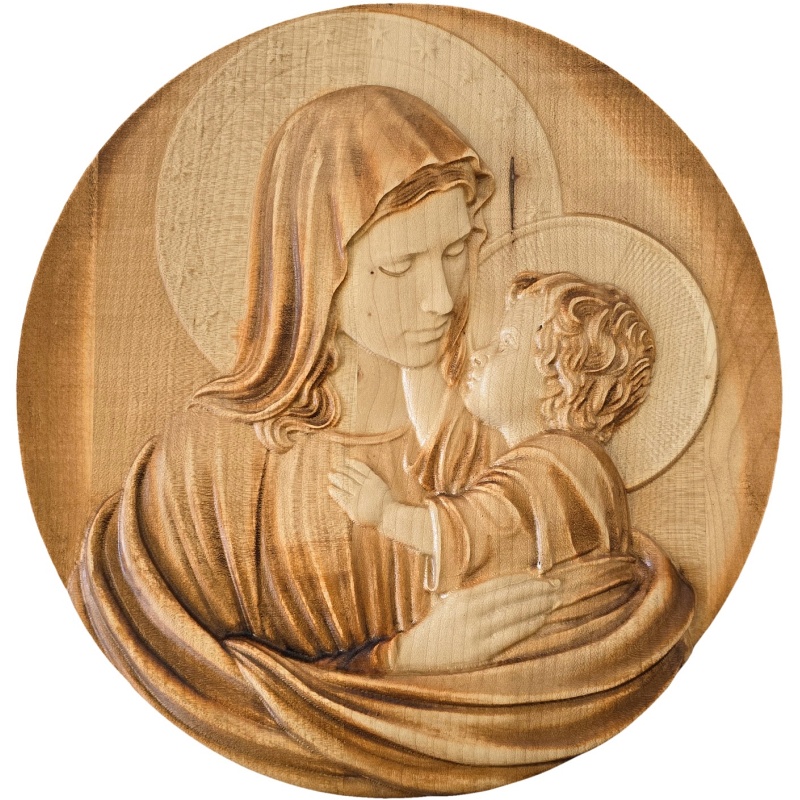 Cette magnifique image en bois de la Vierge Marie avec l'Enfant Jésus, d'un diamètre de 39 cm, est un puissant symbole d'amour, de maternité et de tendresse. Sculptée avec une précision extraordinaire dans du bois massif, elle représente un moment intime entre la Mère de Dieu et son Fils – un regard empreint de silence, de sécurité et de profonde connexion spirituelle. Le contact et le regard mutuels de Marie et de Jésus créent un équilibre émotionnel qui se transmet également au spectateur et constitue une pièce maîtresse paisible et aimante de tout espace. Les lignes plastiques des visages, des mains et des plis de la robe sont réalisées à la main avec une attention particulière portée aux détails. Les subtiles transitions entre ombre et lumière, ainsi que la teinte naturelle du bois, confèrent au relief une profondeur et une force visuelle exceptionnelles. Le cercle, forme de la composition entière, symbolise l'éternité, la protection et l'unité – ce qui incarne précisément la relation entre la Mère et le Fils. Ce tableau est non seulement une œuvre d'art, mais aussi un encouragement spirituel quotidien.