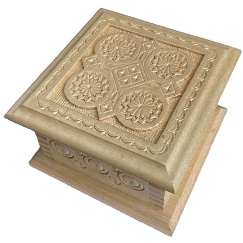 Mettez en valeur vos bijoux ou petits trésors avec une petite boîte à bijoux en bois qui attire l'attention par sa sculpture délicate et son motif typiquement folklorique. Grâce à un travail artisanal soigné et à un bois de qualité, cette boîte s'intégrera parfaitement aux intérieurs rustiques comme modernes, où elle apportera une touche d'élégance artisanale.