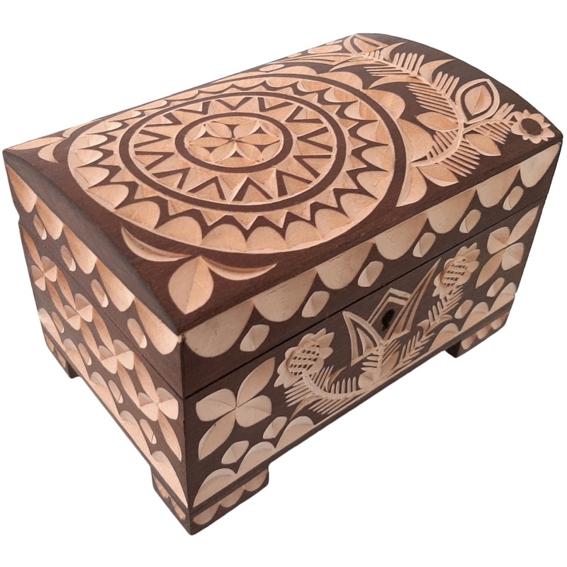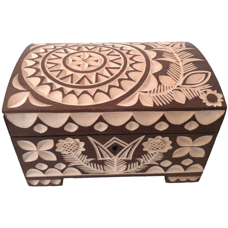 Apportez dans votre maison une petite boîte à bijoux en bois avec des ornements folkloriques finement sculptés et un fond sombre, qui attirera immédiatement l'attention des visiteurs et des amateurs de sculptures artistiques. Cet élégant coffret protégera non seulement vos bijoux ou objets précieux, mais embellira également n'importe quel espace grâce à son magnifique design folklorique.