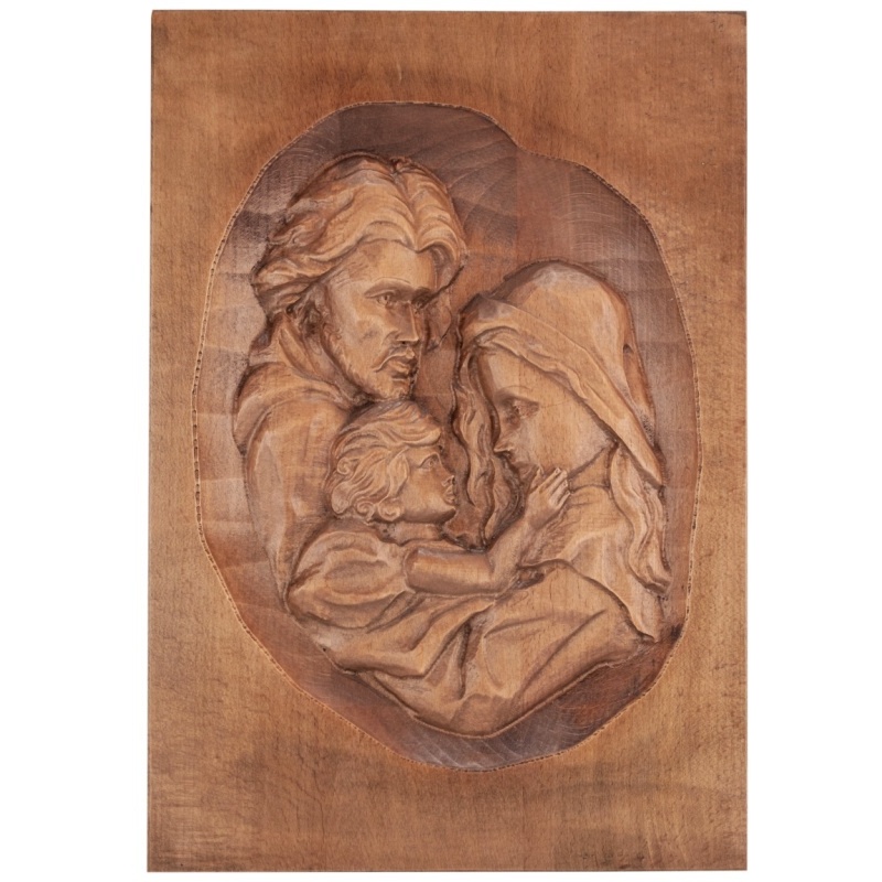Cette exceptionnelle peinture sur bois représente la Sainte Famille – Joseph, Marie et l'Enfant Jésus – dans un moment d'intimité et d'amour, empreint d'une communion mutuelle. Chaque regard, chaque contact et chaque geste entre les personnages rayonnent de proximité, de compréhension et d'unité familiale. Le relief, sculpté avec précision dans le bois massif, a conservé sa structure naturelle, ce qui confère à la scène profondeur et authenticité.Les visages des personnages sont calmes et concentrés : Joseph porte un regard protecteur vers la famille, Marie incline doucement la tête vers l'enfant et l'Enfant Jésus se tourne avec confiance vers sa mère. Cette composition symbolise non seulement la Sainte Famille, mais aussi l'essence même de l'amour, du foyer et du lien spirituel.