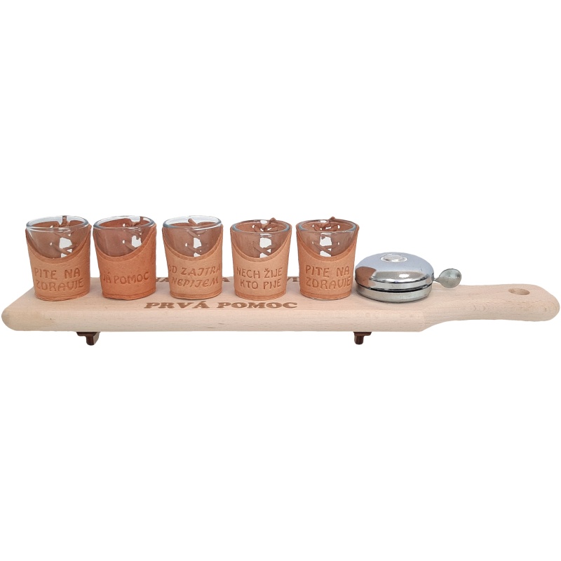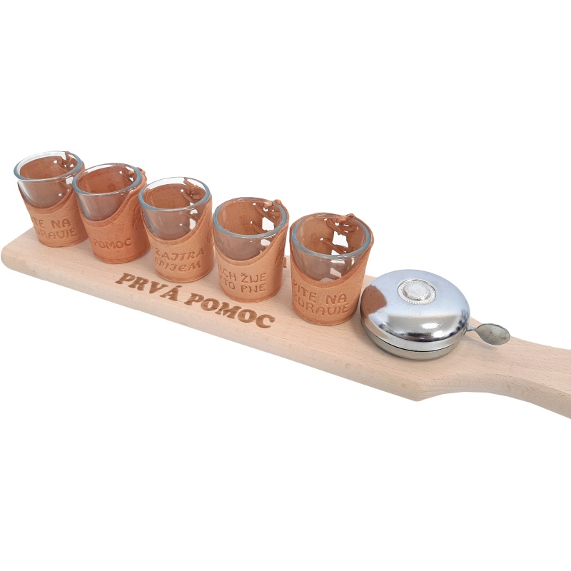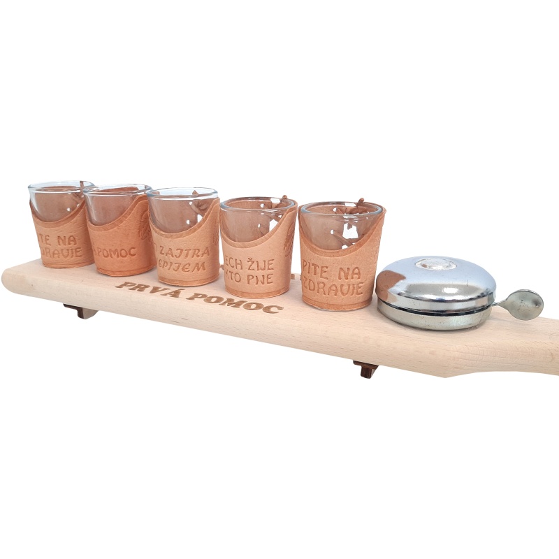 Matériaux de qualité – bois, verre et métal – Le plateau est en hêtre massif, les verres sont en verre avec des étuis en cuir et une clochette métallique pratique.
