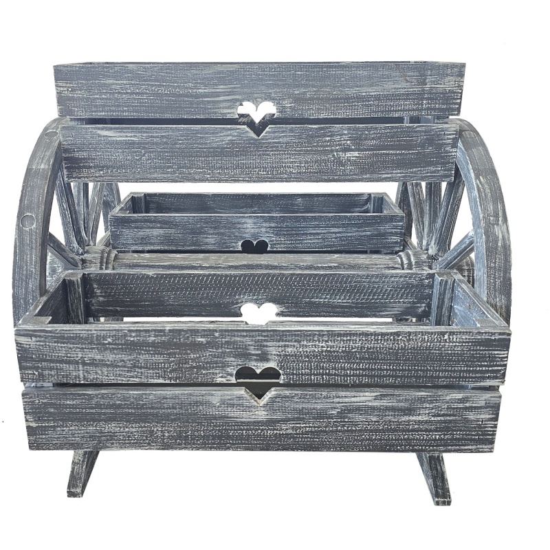 Ce charmant pot de fleurs en bois en forme de chariot décoratif est non seulement un ajout pratique à votre jardin ou terrasse, mais aussi un élément esthétique remarquable qui attire immédiatement le regard. Grâce à sa structure à trois niveaux et à sa finition patinée grise subtile, il évoque un style campagnard vintage. Ses découpes en forme de cœur, ses roulettes en bois massif et son travail manuel précis lui confèrent caractère et originalité, s'intégrant aussi bien aux extérieurs traditionnels qu'élégants.