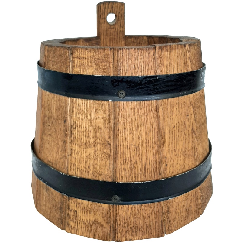 Ce contenant décoratif en bois est un accessoire élégant et intemporel au caractère rustique affirmé. Il se caractérise par sa forme traditionnelle en tonneau, composée de lattes de bois individuelles, solidement reliées par deux anneaux métalliques noirs. Le dessus du contenant est doté d'une boucle pratique avec un trou de suspension, ce qui multiplie ses possibilités d'utilisation. Le veinage naturel du bois, associé à des éléments sombres, crée un contraste harmonieux, ce qui en fait un objet idéal pour les intérieurs et les extérieurs, dans un style rustique, campagnard ou vintage.