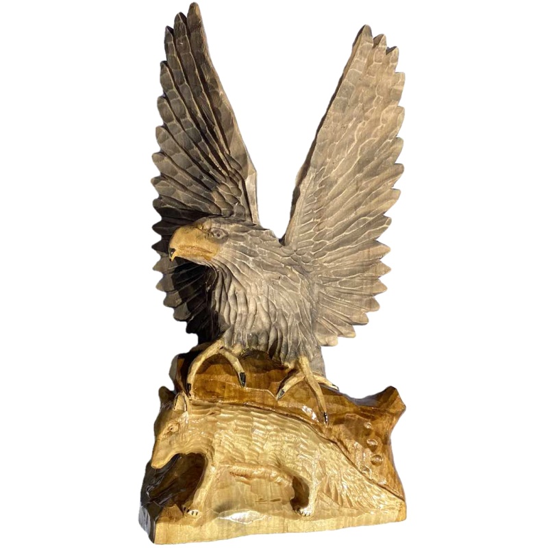 • Composition symbolique chargée de sens – L'aigle, symbole de liberté et de puissance, complété par un loup sculpté, représente la nature, l'instinct et l'équilibre entre force et sagesse.