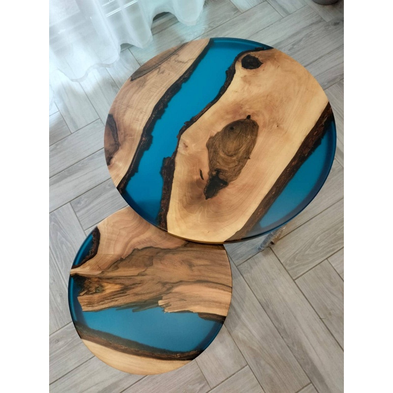Cet ensemble exceptionnel de deux tables basses illustre parfaitement l'harmonie du bois naturel et du design moderne. Le design original du plateau en bois massif, relié par une bande contrastante en résine époxy bleu turquoise, évoque une rivière s'écoulant à travers le paysage. Il crée non seulement une expérience visuelle, mais aussi une atmosphère de paix, d'originalité et de beauté naturelle. Fabriquées à la main, ces tables sont uniques : le veinage du bois et la structure de la résine sont uniques.