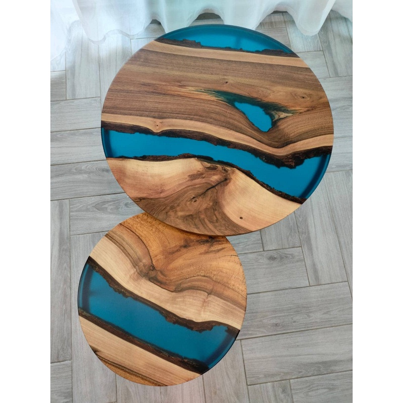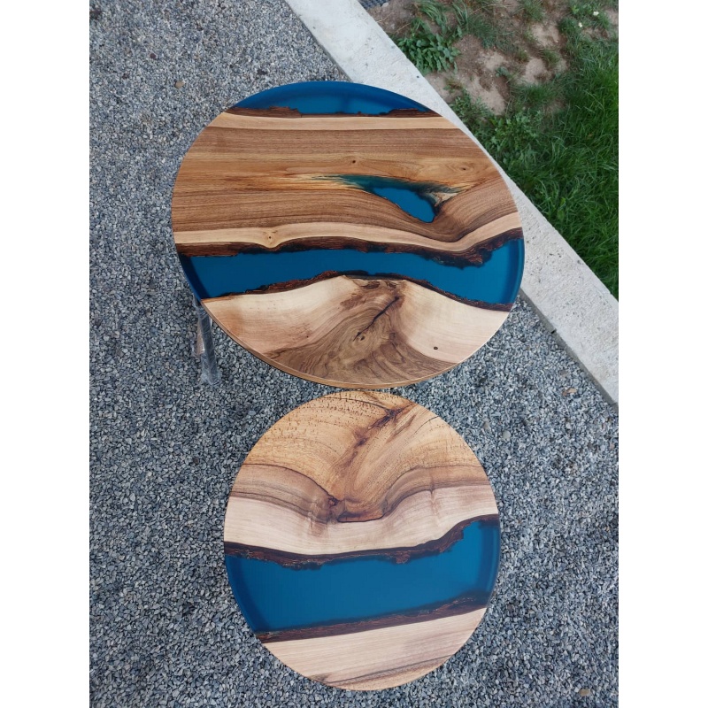 Cet ensemble de tables basses design se distingue par sa finition exceptionnelle et le contraste artistique entre le bois naturel et la résine époxy, dans une magnifique teinte bleu turquoise. Chaque table est une création artisanale originale, incarnant l'équilibre parfait entre précision artisanale et style moderne. L'impressionnant veinage du bois qui traverse l'époxy lisse comme un miroir crée l'illusion d'une rivière paisible et apporte calme, chaleur et originalité à votre intérieur.