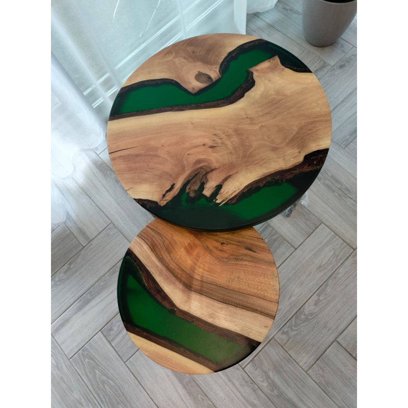 Cet ensemble design de deux tables basses rondes allie à la perfection style moderne, matériaux naturels et savoir-faire artisanal. Les plateaux sont en bois massif de haute qualité, dont le veinage riche contraste avec la résine époxy verte, précisément moulée dans le bois, imitant le doux murmure d'une rivière ou le relief d'un paysage. Grâce à cette combinaison, ces tables sont de véritables objets d'art, apportant harmonie, fraîcheur et originalité à votre intérieur.