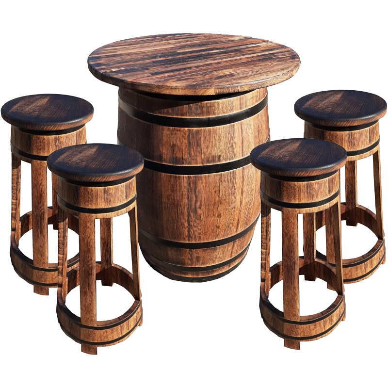 D’accuei » Meubles en tonneau de chêne » Table tonneau + 4 chaises tabourets foncées