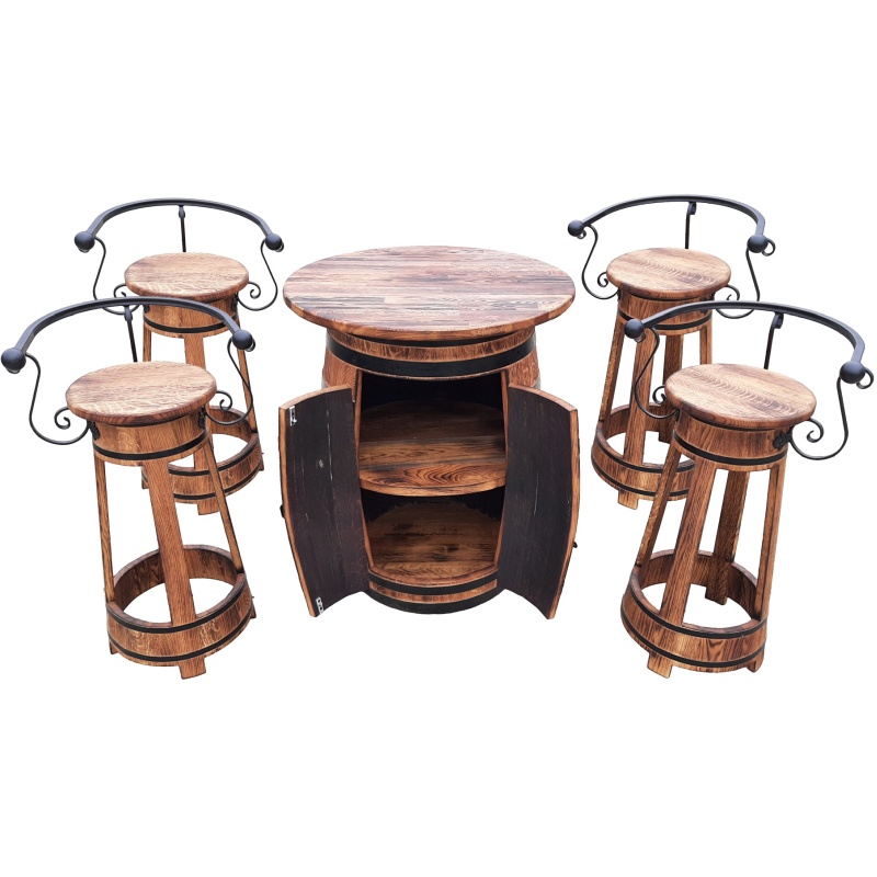 D’accuei » Meubles en tonneau de chêne » Table tonneau + 4 tabourets avec dossier en métal