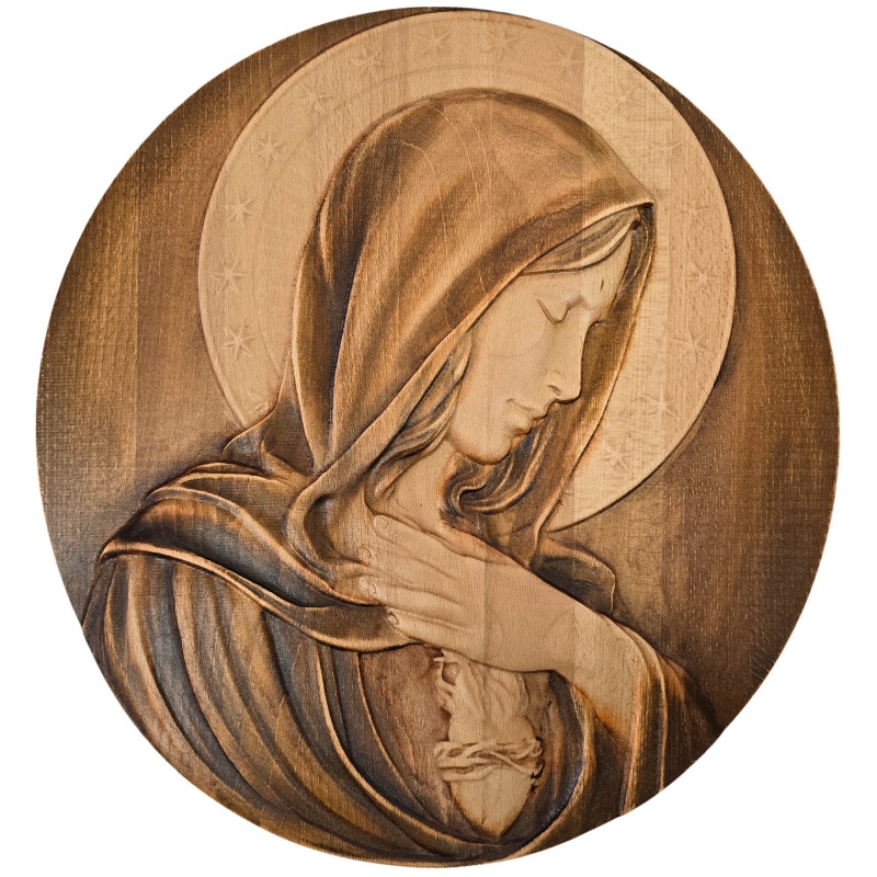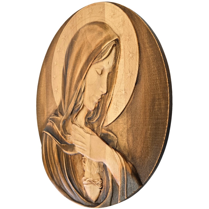 Cette magnifique image en bois de la Vierge Marie, la tête humblement inclinée, mesurant 40 cm de diamètre, représente la Mère de Dieu avec douceur, calme et émouvante, dans une attitude d'humilité, de compassion et de foi. Sculpté à la main dans du bois massif, le relief représente le visage de Marie légèrement incliné, les yeux clos et la main posée sur son cœur, symbole d'abandon, de prière silencieuse et de profonde expérience intérieure. Au-dessus de sa tête se détache un halo d'étoiles gravées, soulignant la dimension céleste et sacrée de cette femme extraordinaire. L'image est réalisée avec un grand souci du détail et un équilibre harmonieux d'ombres et de lumières. Les fines lignes plastiques, le veinage naturel du bois et la patine à la main créent une impression de présence vivante et pourtant mystique. La forme du cercle souligne la plénitude, l'éternité et l'étreinte maternelle qui émanent de la scène elle-même. Ce relief est plus qu'un simple objet d'art : c'est une image porteuse de paix, de beauté et de profondeur spirituelle.