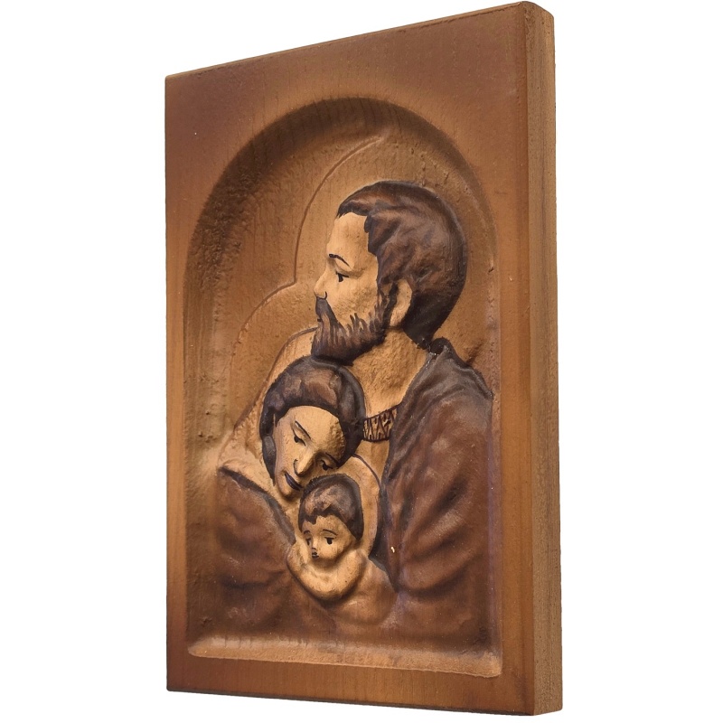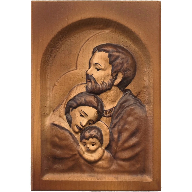 D’accuei » Peintures sculptées à la main » Tableau en bois de la Sainte Famille 10 x 14 cm