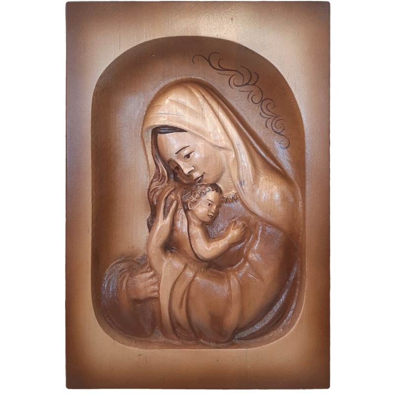 • Relief en bois finement modelé au contenu spirituel exceptionnel – L'image est extrêmement intime et émouvante – les visages de Marie et de Jésus sont sculptés avec amour, chaque détail porte un message spirituel de foi, de tendresse et d'espoir.