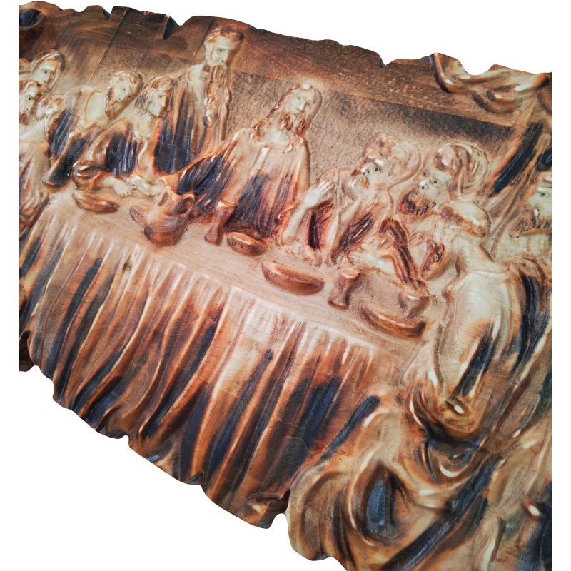 Ce tableau sculpté à la main capture l'un des moments les plus importants de la tradition chrétienne : la Cène de Jésus-Christ avec ses disciples. Avec ses dimensions de 80 × 36 cm, il offre une vue impressionnante d'une scène pleine d'expression, de symbolisme et de finesse des détails. Le rendu artistique capture la dynamique et les émotions des personnages à table, tandis que la figure centrale du Christ, calme et rayonnante, est entourée par les gestes dramatiques des apôtres.