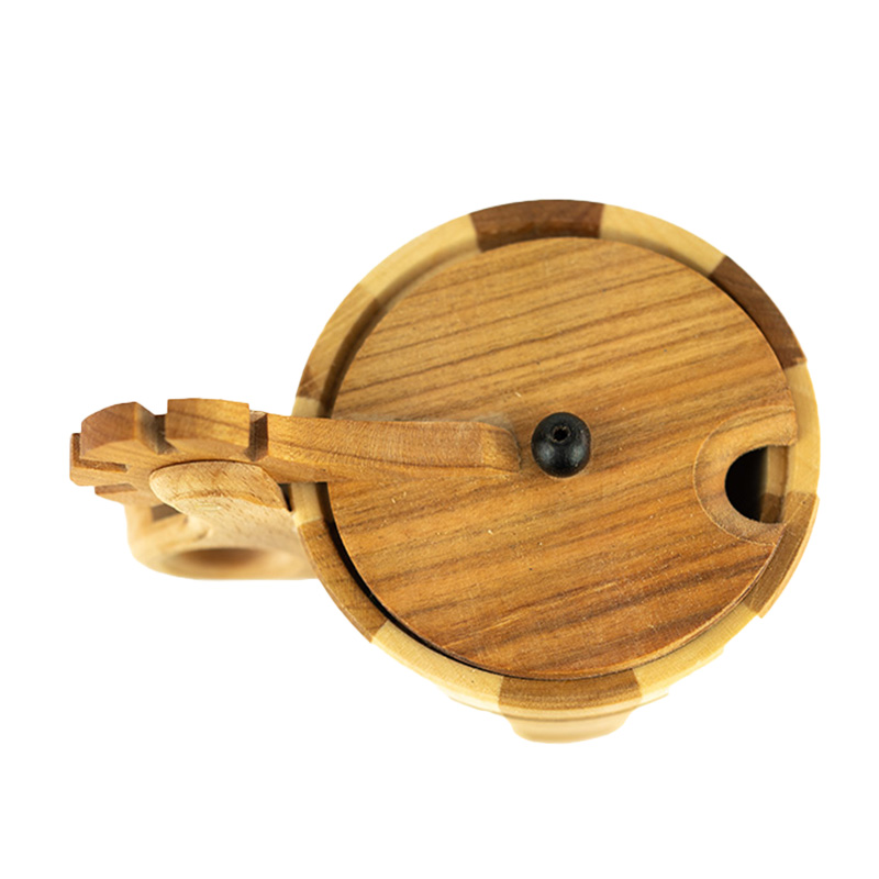 Cette tasse en bois unique impressionne dès le premier coup d'œil par son design original et sa finition soignée. Fabriquée en bois dur de haute qualité, elle présente un motif naturel chaleureux et authentique. Sa forme spécifique, ses lignes légèrement coniques et ses rayures gravées symétriques sur tout le pourtour soulignent son caractère rustique et son esthétique folklorique traditionnelle. Son anse profilée, ornée d'un motif décoratif en forme de robinet, lui confère non seulement une allure originale, mais aussi une prise en main confortable. Le couvercle, muni d'une petite boule en bois, s'ajuste parfaitement, permettant ainsi à la tasse de servir de petit récipient hermétique.