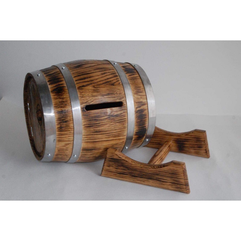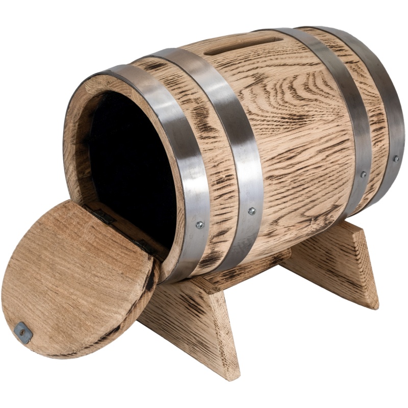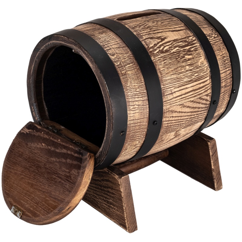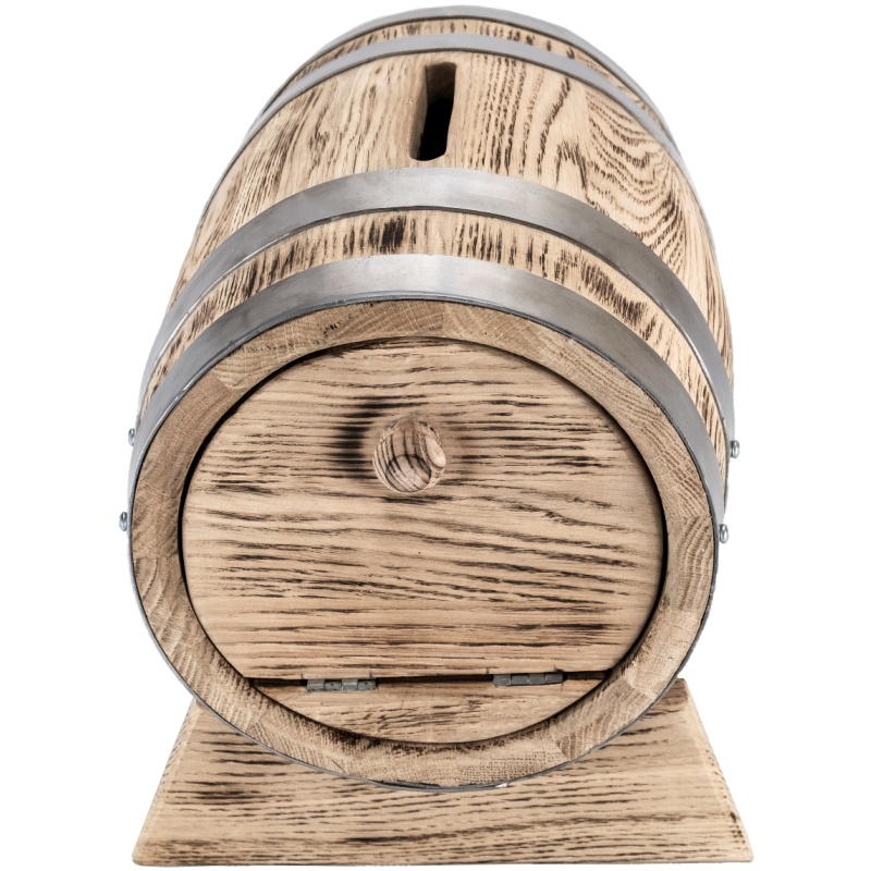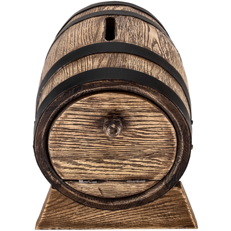Cette tirelire originale en forme de tonneau est non seulement un rangement pratique pour vos économies, mais aussi un accessoire original qui attirera tous les regards dans n'importe quel intérieur. Fabriquée en chêne de haute qualité, ornée d'anneaux métalliques et soutenue par un socle en bois massif, elle se distingue par son aspect rustique et son savoir-faire artisanal. La surface est teintée dans une teinte foncée ou claire, ce qui met en valeur le veinage naturel du bois et confère au tonneau authenticité et élégance.