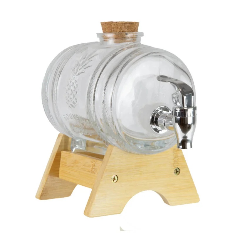 Tonneau en verre 1L transparent avec socle en bois et robinet - ananas