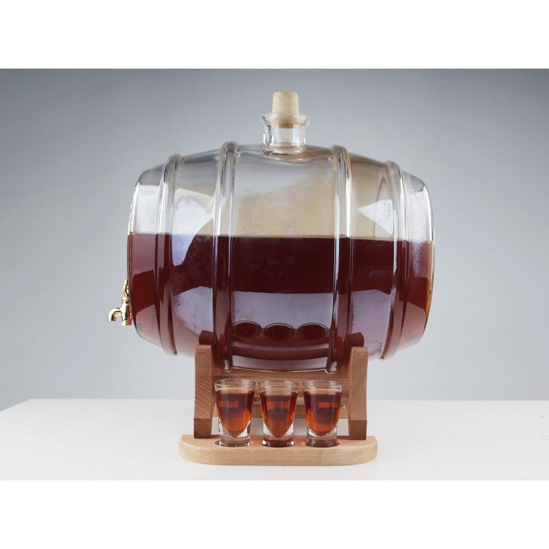 Tonneau en verre 4L transparent avec socle en bois, robinet et verres