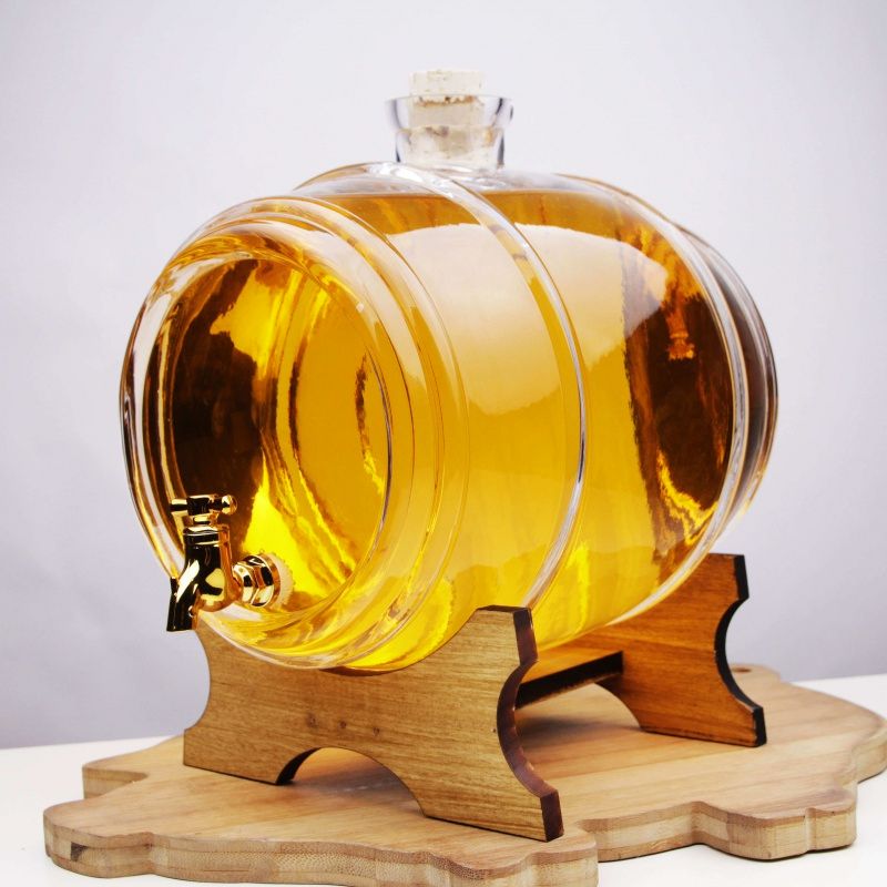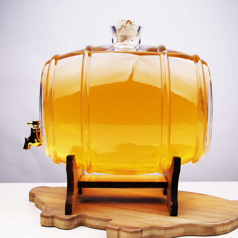 D’accuei » Fûts en verre » Tonneau en verre 5L transparent avec base en bois et robinet doré
