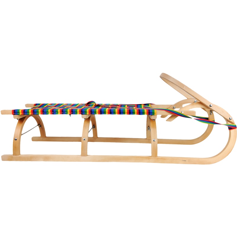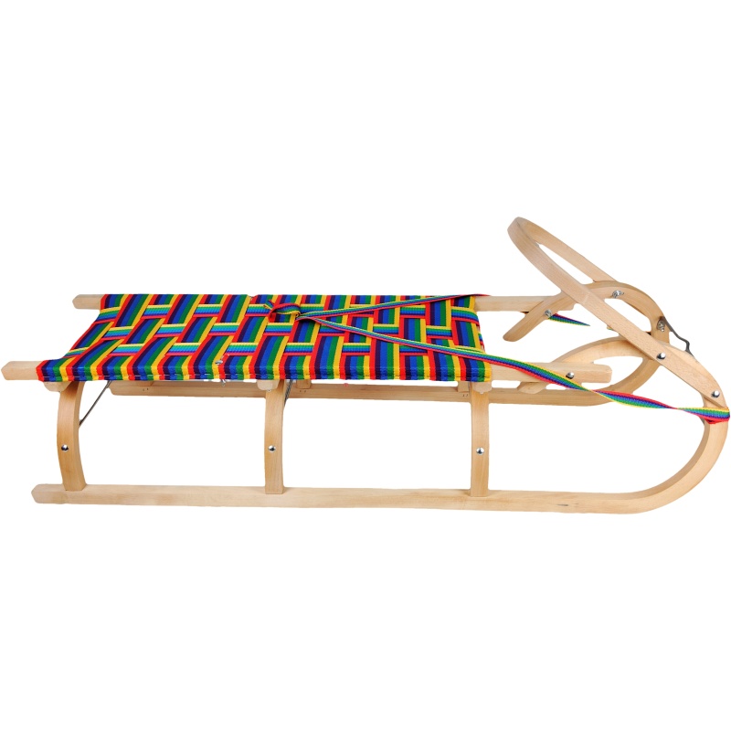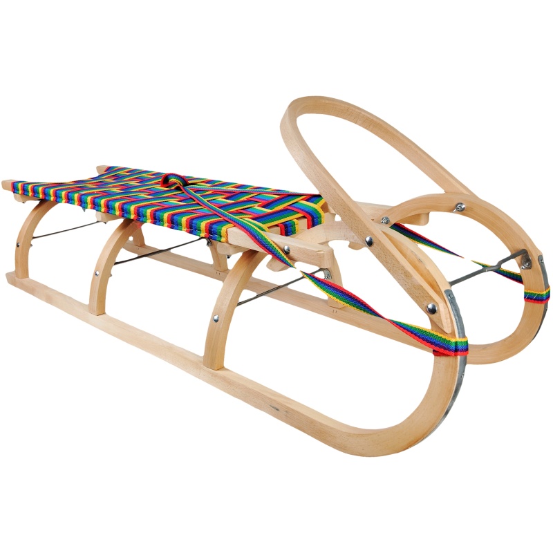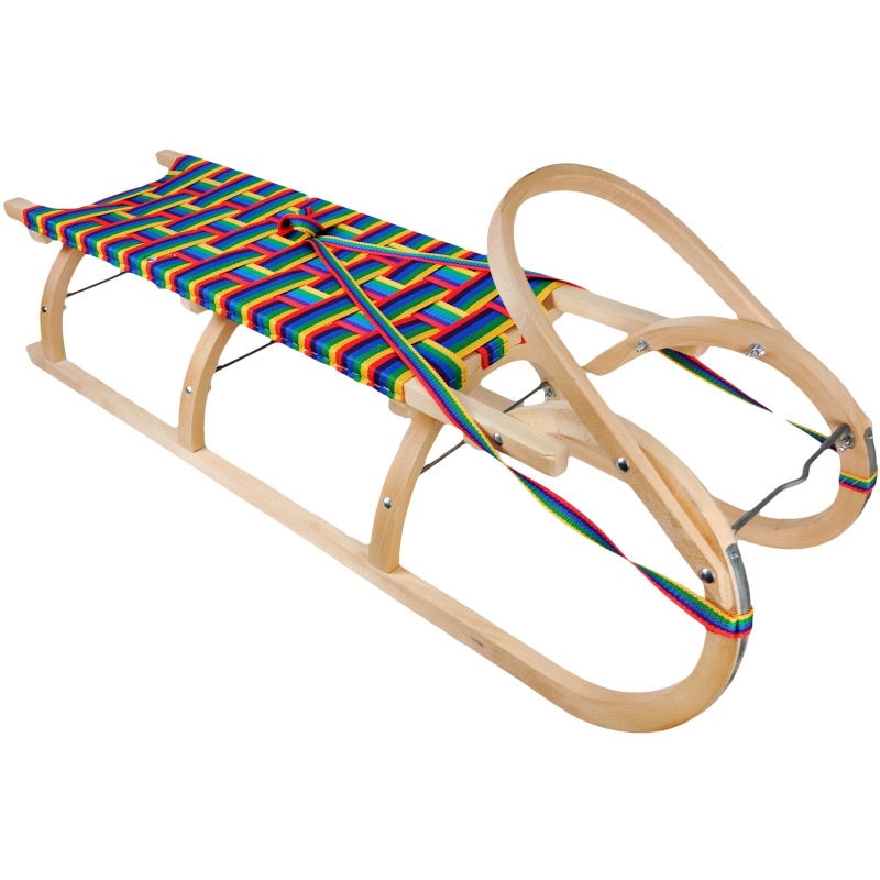 Cette luge en bois sans dossier allie un savoir-faire artisanal authentique à un design attrayant et coloré. Elle se caractérise par une construction robuste en hêtre, une poignée avant aux formes précises et un large siège tressé aux couleurs vives. Grâce aux trois arches sous le siège, elle est extrêmement stable et répartit uniformément la charge, ce qui la rend idéale pour les enfants et les adolescents. Des renforts métalliques et des dispositifs de sécurité au niveau des articulations garantissent que cette luge résistera aux trajets les plus exigeants ou à une utilisation fréquente.