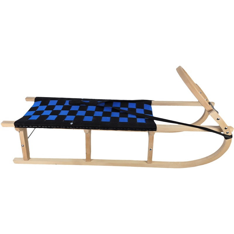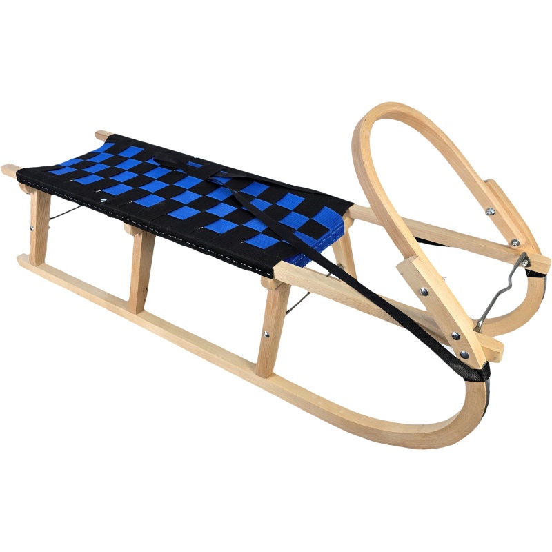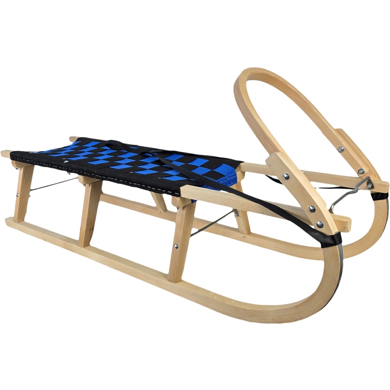 Cette élégante luge en bois sans dossier, dotée d'une assise noire et bleue distinctive, allie à merveille la forme traditionnelle d'une luge à des éléments visuels modernes. Elle est dotée d'un cadre en hêtre massif, d'une arche avant profilée pour une traction aisée et de renforts métalliques qui augmentent la stabilité globale. L'assise en sangles, bien tendue et résistante à l'humidité, garantit une utilisation confortable et durable. Idéale pour un usage quotidien, les excursions et les vacances à la neige.