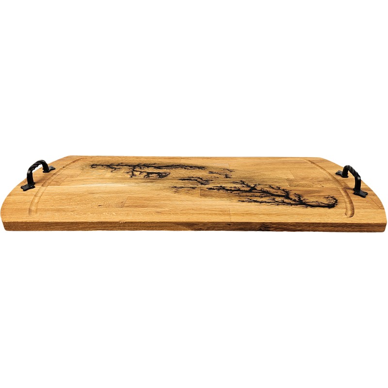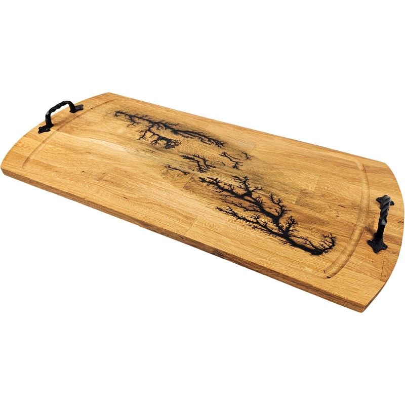 Cet élégant plateau en bois allie la beauté naturelle du chêne à la finition artistique unique d'un motif brûlé. Grâce à sa construction robuste en bois massif de haute qualité et à ses poignées métalliques pratiques, il est idéal pour le service, la décoration et un usage quotidien à la maison. Chaque pièce est originale : grâce à la technique de cuisson électrique, des motifs uniques en forme d'arbre, imitant la lumière naturelle, apparaissent sur la surface du plateau.