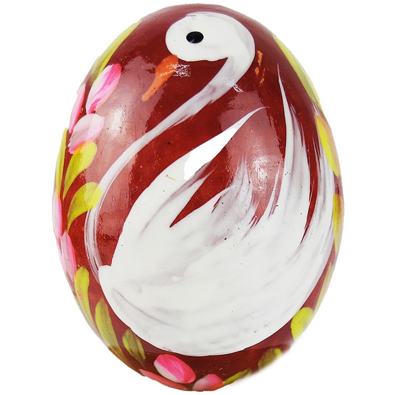 Ce magnifique œuf de Pâques se distingue par son fond bordeaux profond, sur lequel se détache délicatement un élégant cygne blanc, entouré d'ornements floraux aux tons roses et jaunes. Le motif peint à la main sublime chaque coup de pinceau, donnant à chaque pièce l'allure d'une œuvre d'art originale. Symbole de beauté, de pureté et d'amour, le cygne confère à l'œuf de Pâques une dimension spirituelle et visuelle exceptionnelle.