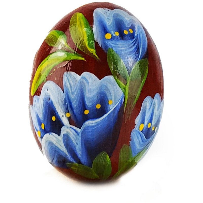 Ce charmant œuf de Pâques allie avec brio couleurs traditionnelles et délicatesse artistique. Le fond marron, chaleureux et naturel, met en valeur les fleurs bleu profond à pois jaunes, évoquant des clochettes en fleurs. Les feuilles vertes complètent la composition et apportent une touche de fraîcheur et de vivacité à la décoration. Chaque coup de pinceau est visible et unique, soulignant le travail manuel et le caractère unique de cet œuf de Pâques.