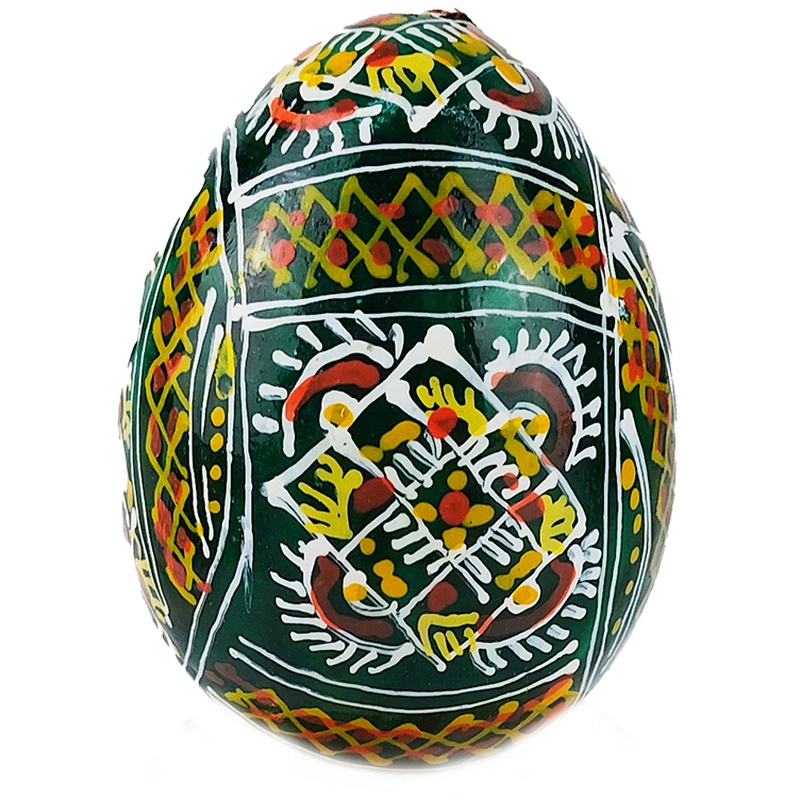 Cet œuf de Pâques unique impressionne par son fond vert foncé profond, à la fois noble et élégant. Les ornements aux couleurs contrastées de blanc, jaune, rouge et orange sont soigneusement peints à la main et créent un motif riche et visuel, inspiré des traditions populaires. Les motifs symboliques aux lignes fines et aux structures géométriques évoquent les coutumes pascales, le renouveau spirituel et le renouveau printanier. Chaque pièce possède un caractère original, ce qui en fait non seulement un objet de décoration, mais aussi un précieux objet d'art.