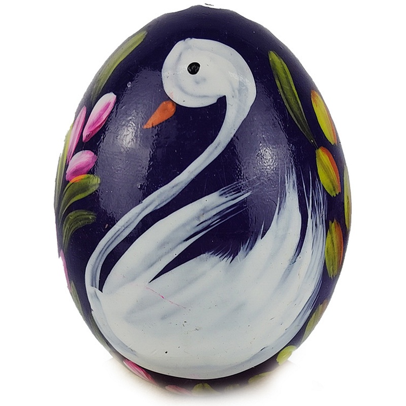 Cet élégant œuf de Pâques au riche fond bleu foncé représente un cygne blanc et doux flottant gracieusement parmi les fleurs. Le contraste des couleurs, combiné à une peinture à la main soignée, crée une impression d'harmonie et de sérénité. Le cygne, symbole de pureté, de loyauté et de paix, se détache sur un fond sombre aux subtils détails verts et roses qui rehaussent l'impression artistique générale.