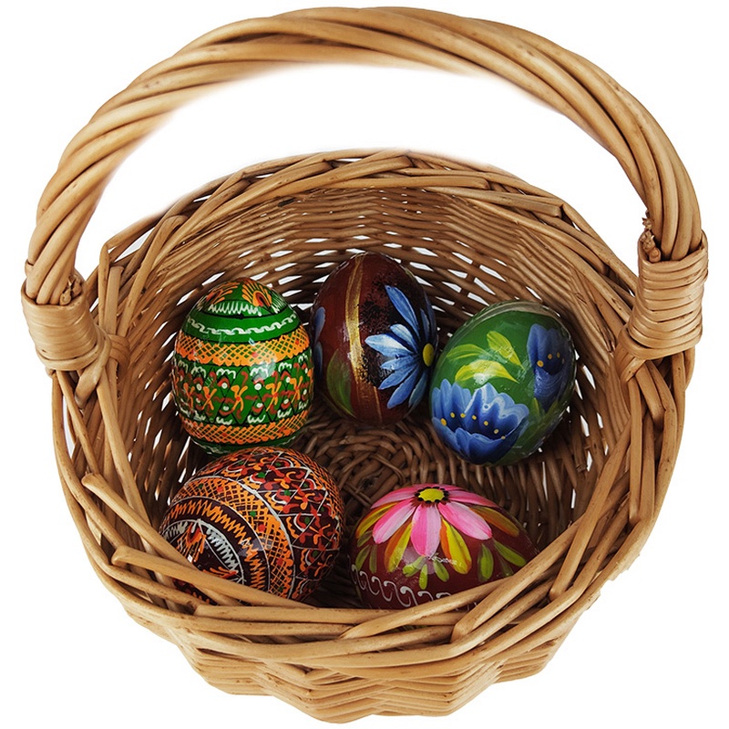 Cet ensemble de cinq œufs de Pâques impressionnera par sa fabrication artistique unique et son caractère artisanal traditionnel. Chaque œuf est original : peint à la main aux couleurs vives, avec des motifs floraux, folkloriques et des décorations de Pâques. Ils sont rangés dans un joli panier tressé en osier naturel, créant ainsi un ensemble impressionnant, prêt à être exposé ou offert.