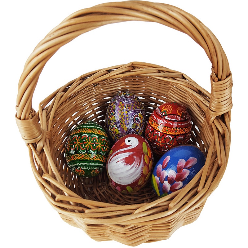 Un ensemble de cinq œufs de Pâques dans un panier en osier allie artisanat traditionnel et ambiance festive colorée. Chaque œuf est peint à la main avec des motifs originaux évoquant le folklore, la nature et le symbolisme du printemps. Le panier en osier naturel confère à l'ensemble un aspect à la fois rustique et élégant, idéal pour une décoration de Pâques.